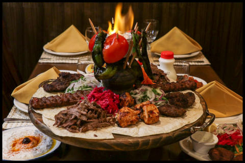 grilled on skewers then wrapped with lavash bread. Topped with